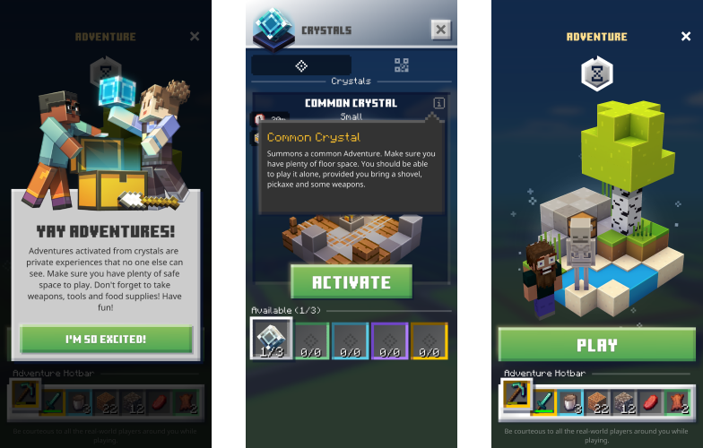 There will be several types of crystals available: common, unusual, rare, epic, and legendary. Currently, the last two types are still in development and not yet accessible in Minecraft Earth. The other adventure crystals can be discovered in tappables. Additionally, by completing daily tasks, you will earn one crystal each day. At the end of every adventure, a chest awaits you, filled with valuable items, including crystals. Moreover, there’s a chance to obtain rarer types than those available in the early stages of the game.