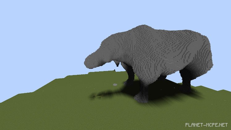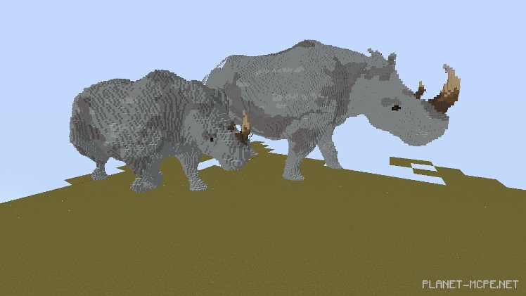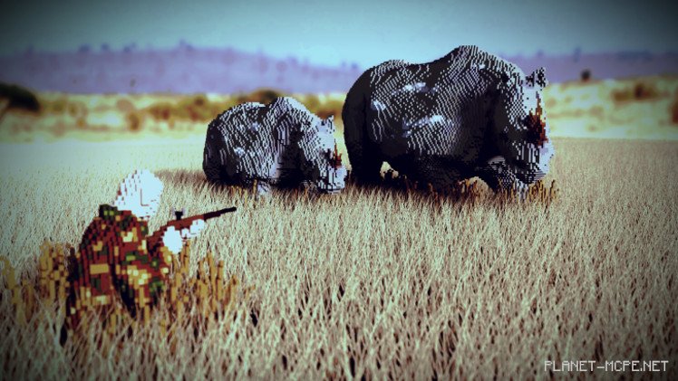 Sadly, not everything is so bright: a person half-hidden in the bushes aims a gun at these defenseless creatures. Recently, the white rhinoceros species has completely vanished due to poaching. This prompted builder MineSheep to draw attention to this issue through his creativity in Minecraft Pocket Edition.