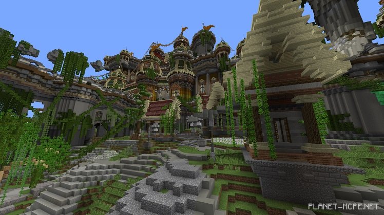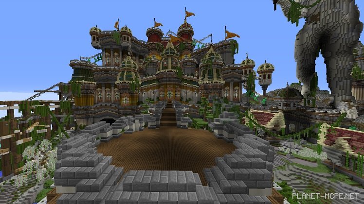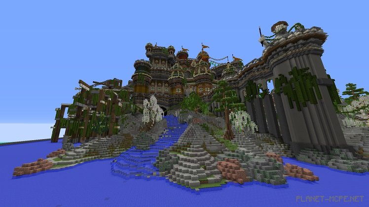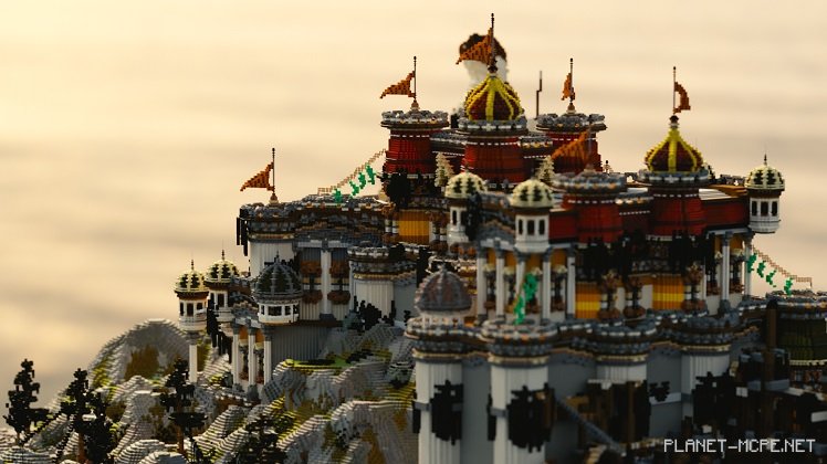 Despite the predominantly bright colors of the build, white plays a crucial role. It forms the cliffs, walls, and the statue itself. To prevent everything from blending into a confusing white mass, various shades of this color are used: the cliffs are slightly paler than the other structures. When viewing the build as a whole, no part gets lost against the others, positively impacting players’ visual experience.
