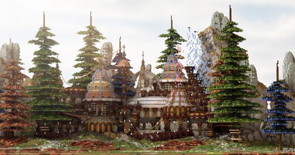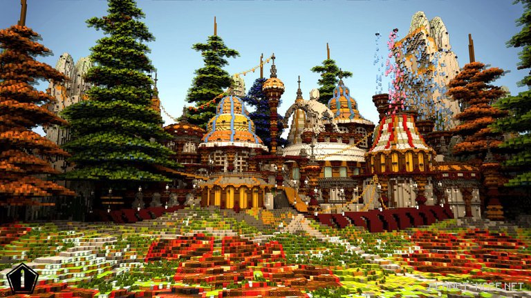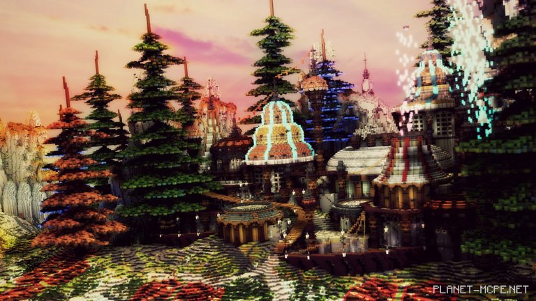 In a small area where the terrain outlines can be seen in MCPE, you will find a depiction of pine trees, rocky cliffs rising behind them, and a cluster of buildings situated at the center. Each element is unique. The trees challenge their evergreen status as they appear in shades of red and blue! The cliffs are peculiar, featuring crystalline protrusions resembling stalagmites (likely inspired during a BFC viewing). Meanwhile, the buildings are richly adorned with cylindrical elements and sealed roofs; surprisingly, this design relates to oatmeal, making it distinctive and specifically crafted by Donut for Minecraft Pocket Edition.