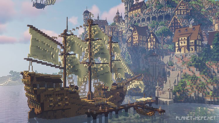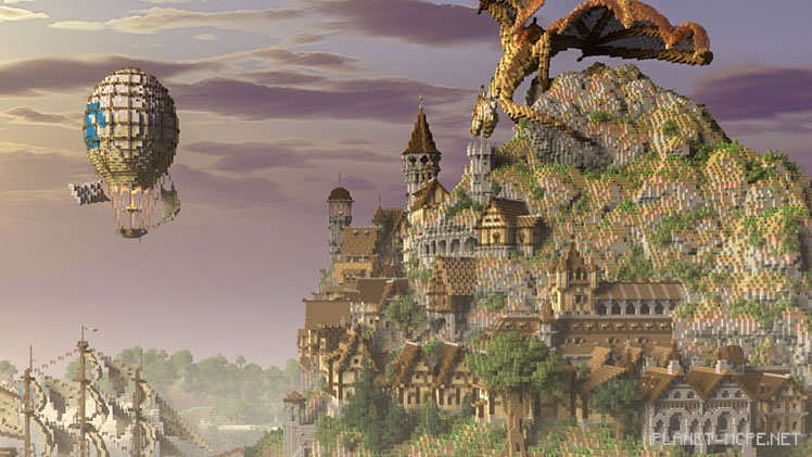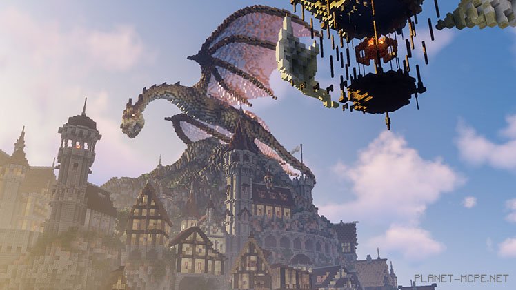 The appearance of builder Bishop on the Shadow Kingdom server might lead you to believe you’ve downloaded the wrong game. Towering over the mountain village is a massive dragon with its wings spread wide and jaws agape, poised either to incinerate all the wooden houses or devour everyone present. Or perhaps both at once. Fortunately, some villagers managed to escape using a beautiful hot air balloon and a large ship sailing away on swift waves.