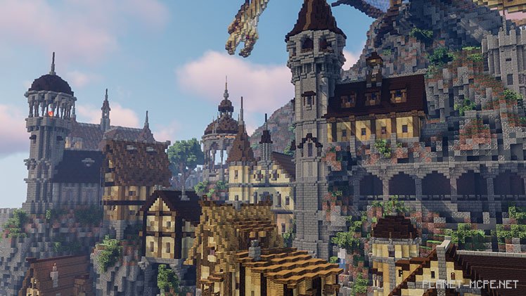 But first impressions can be misleading! In reality, the dragon isn’t destroying the village; rather, it’s protecting it. According to Bishop, this guardian of the small town is a natural feature of Minecraft Bedrock. Each little house is nearly one-of-a-kind, and all structures were intentionally built on the hillside to create an impression that everything was crafted by hand.