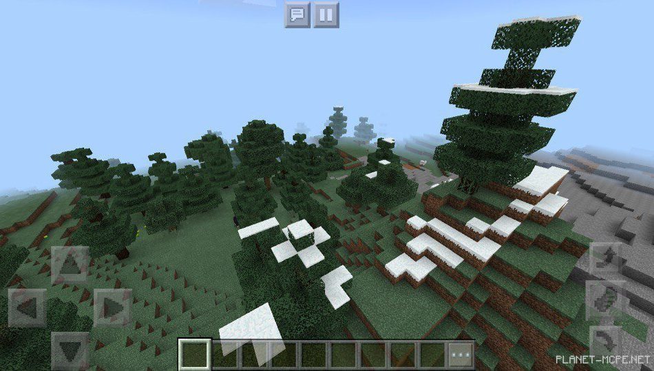 On this map in Minecraft Pocket Edition, there is a large mountain that appears square-shaped, surrounded by a coniferous forest in Minecraft PE 1.2. This feature looks quite appealing on the platform MCPE.