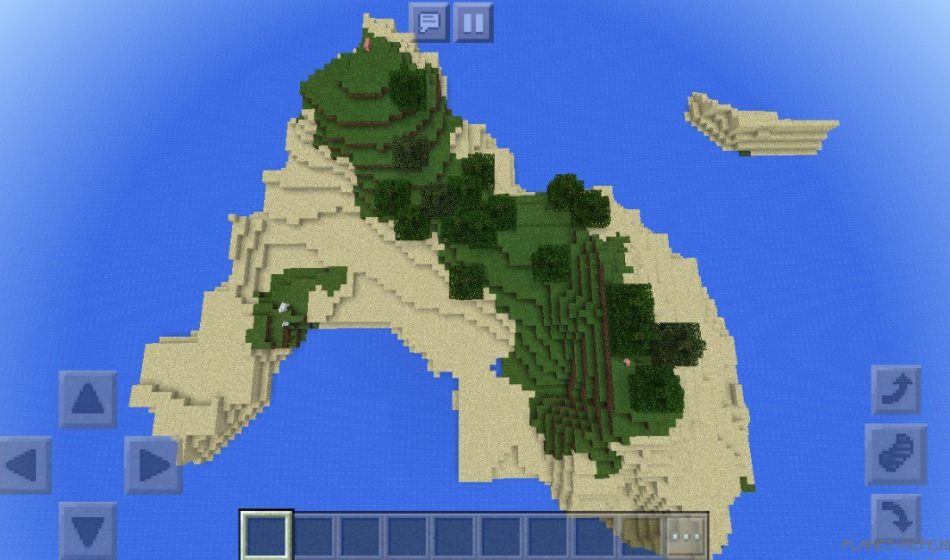 On this seed in Minecraft Pocket Edition, you will discover a vast island where you spawn in Minecraft PE. The area is rich with vegetation and surrounded by plenty of water on the MCPE platform, along with a small nearby isle.