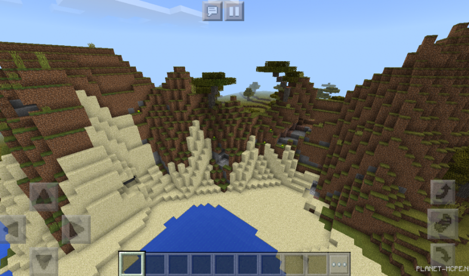 You will also encounter a large acacia biome near a body of water, while a cave can be found in the mountains.