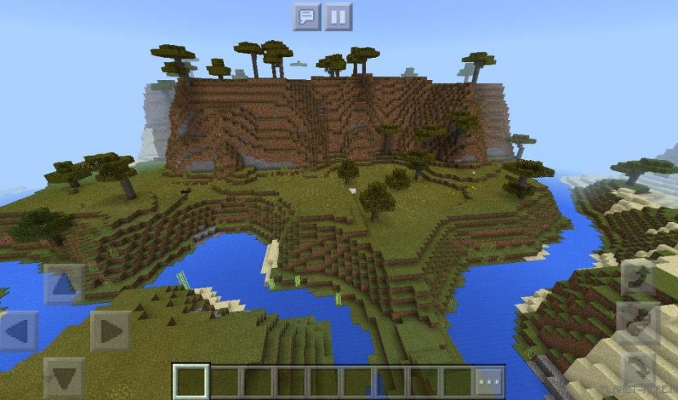 In Minecraft Pocket Edition, you’ll also find an acacia biome featuring mountains adorned with many trees on the MCPE platform. Additionally, in Minecraft PE, there are several winding streams nearby, alongside a desert area.