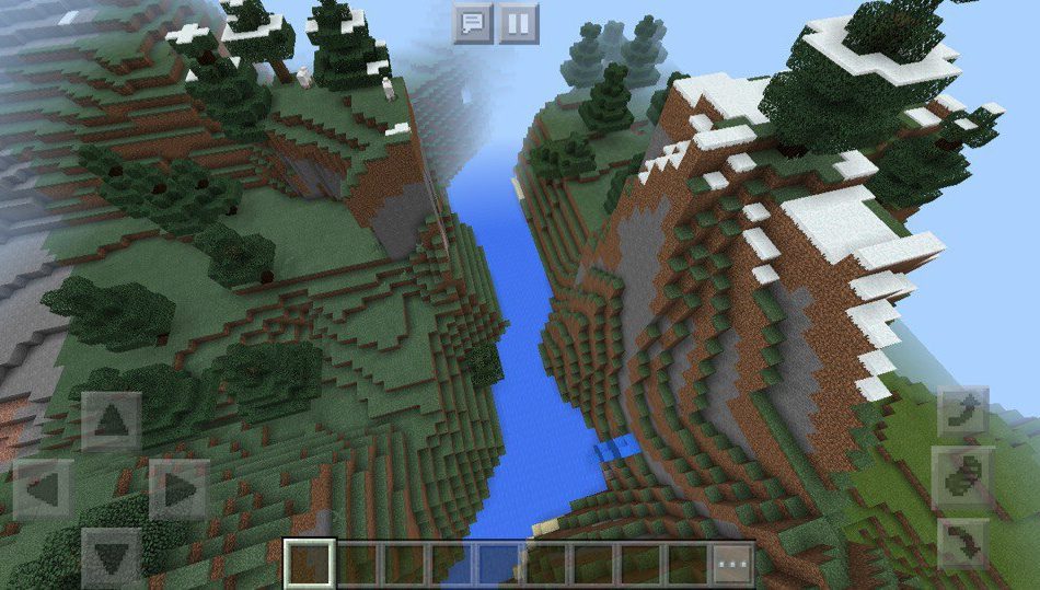 Seed with waterfall and more 1.2Additionally, there is a snowy biome within the mountains. A river divides the peaks, flowing through the center of the snow-covered area in Minecraft Pocket Edition.