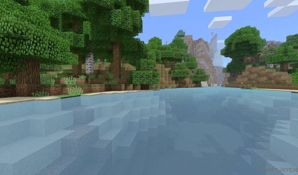 Energy (Энергия) – shaders that can be nominated for an award. The clouds in the world of Minecraft Pocket Edition are beautifully reflected in the water, and the shadows cast by blocks look stunning. Block colors have become more lifelike and now also reflect in the water. Additionally, when you enter the water, your vision shakes just like it does in real life.