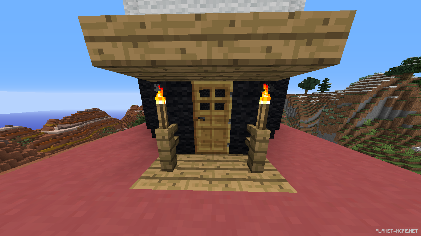 Делаем вход. Нам понадобятся дубовые доски,забор,дверь,дубовые плиты,факелы.