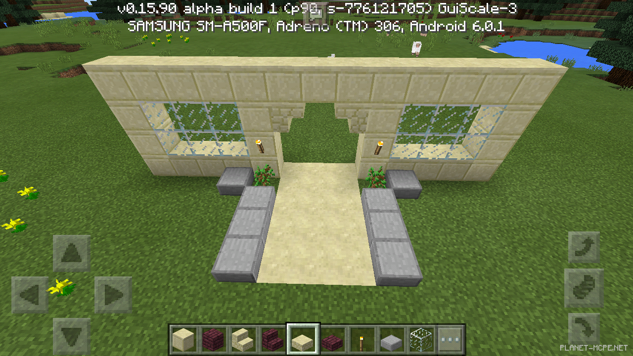 Как видите, я оставил проёмы для стёкол. Устанавливаем их. Также строим дорожку из песчаника и каменных полублоков. Для декорации я под факела установил два ростка дерева, которые точно не вырастут, так как им мешают факела.