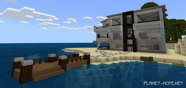 Карта «Sandview Modern House (Современный дом с видом на море)» имеет дом возле моря, расположенный на небольшом берегу. Прямо за домом Вы найдёте тропический лес, который сможете самостоятельно исследовать в Minecraft PE. В передней части дома расположен док, в котором Вы можете припарковать свою лодку или посмотреть на красивое огромное море. Дом представляет собой трёхэтажный особняк с огромным количеством жилой площади, включая несколько спален, кухню и бассейн.