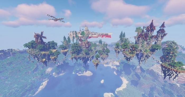 Конечно, основной козырь карты – пользовательские структуры. Они расположились в Minecraft высоко над землей, и до них предстоит сначала добраться. Карта выполнена в стиле «Стимпанк», а это значит, что игроков ждут необычные постройки, дирижабли и паровые механизмы, которые, в лучших традициях игры работать не будут.