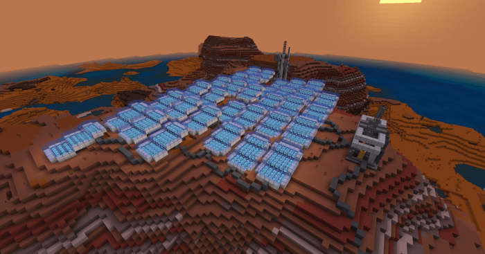 Карта построена на биоме столовых гор, поэтому Вы можете добыть многие «инопланетные руды». В небольшом городке есть все, что Вам может понадобиться — ферма для выращивания еды солнечные батареи и гигантская ракета. В Майнкрафт-версии Марса даже есть кислород, поэтому Вашему персонажу не придется носить скафандр!