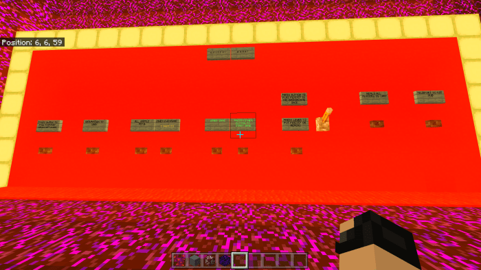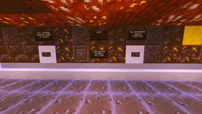 Первой точкой спауна в Майнкрафте является пустая комната, в которой висят приветственные таблички и расположена кнопка начала игры. Дождитесь остальных участников и только потом нажимайте на кнопку. Далее Вы будете телепортированы в следующую комнату. Здесь Вы выбираете один из четырех доступных наборов снаряжения: броня, щиты, исцеление и мечи. Завершив подбор снаряжения, Вы переместитесь в панель управления для персонализации Вашей битвы. Там Вы можете изменить фоновую музыку, увеличить количество золотых яблок. Автор предусмотрел все аспекты, персонализация которых может улучшить игровой процесс.Как только все участники пройдут предыдущие этапы, они будут телепортированы в центр боевой арены. Если один из игроков умирает, он попадает в специальную комнату. Там он сможет начать новый раунд или подготовить настройки для следующего сражения.
