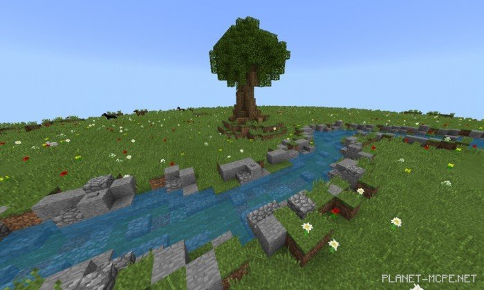 Пользовательский дуб и очень подробная река. Под землей много руд, а также лавы. Любые мобы по-прежнему могут появляться на острове.