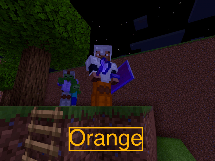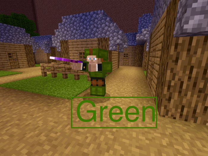 Красный: железная броня, лук с пятой силой, бесконечностью и пламенем.  Синий: железная броня, трезубец с верностью 3 и с пронзителем 5. Увеличение здоровья 5 и медлительность 3.Желтый: кожаная броня, каменный меч, арбалет с ускоренной перезарядкой 2, лук с силой 3, увеличенная скорость 3 и увеличенный прыжок 2. Оранжевый: железная броня, железный топор, арбалет с быстрой перезарядкой 1, щит с регенерацией. Золотое яблоко, повышение здоровье 2, регенерация и поглощение 3. Зеленый: кожаная броня, деревянный меч с отдачей 2, арбалет с тройным залпом, перезарядкой 3, пронзающей стрелой и быстрой перезарядкой 1. Также есть повышение здоровья 1.