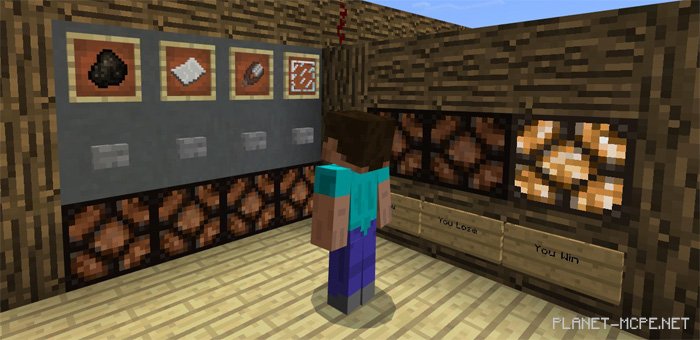 «Камень-Ножницы-Бумага» — простая игра, для игры в которую обычно требуется лишь две руки. Но так как Ваши руки в Minecraft PE не обладают такой же гибкостью, как в реальной жизни, некоторые вещи, такие как «Камень-Ножницы-Бумага» невозможно играть. Но не волнуйтесь! На карте «Rock-Paper-Scissors (Камень-Ножницы-Бумага)» представлено решение в виде механизма из редстоуна, которое позволяет Вам сыграть эту игру в мире МКПЕ.