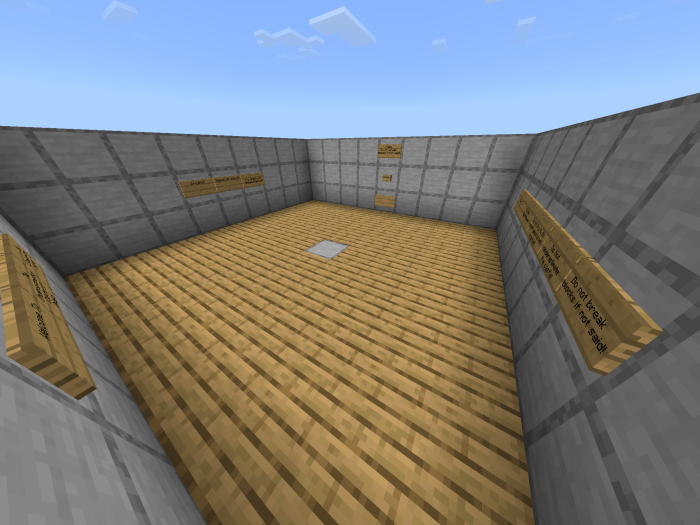 Для начала Вам нужно преодолеть простую стену и найти кнопку. Затем Вас ждет паркур по золотым блокам и прохождение по полу, не задевая размещенные на нем красные блоки. Кажется, что все достаточно просто? А Вы попробуйте пройти все задания за 8 минут!Уровни карты: