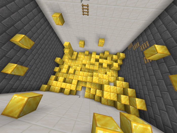 Золотой паркур. Классический паркур Minecraft Bedrock по золотым блокам. Выбор именно этого материала не случаен, это отсылка к Утиным Историям. Если Вы не хотите проходить паркур, то для Вас есть специальная комната, где можно написать имя утки и пройти дальше.