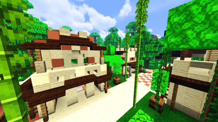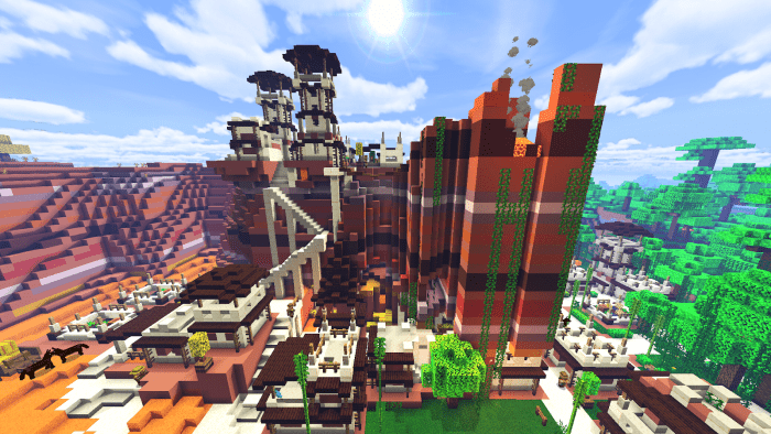 На карте «Village Badlands & Jungle (Деревни Бесплодных земель и Джунглей)» Вы найдете полностью обновленные деревни Minecraft с новыми сооружениями. Яркий биом с разнообразной растительностью контрастирует с практически пустынными бесплодными землями.