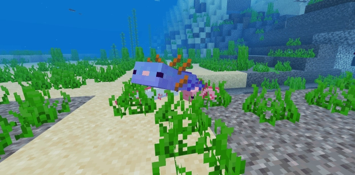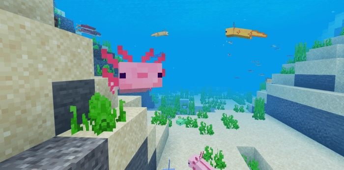 Создания мода Аксолотли (Axolotls) чрезвычайно добры к игроку, поэтому не обижайте их. Они будут плавать с вами в Minecraft Bedrock и окажут помощи при исследовании опасных структур, таких как подводные руины.