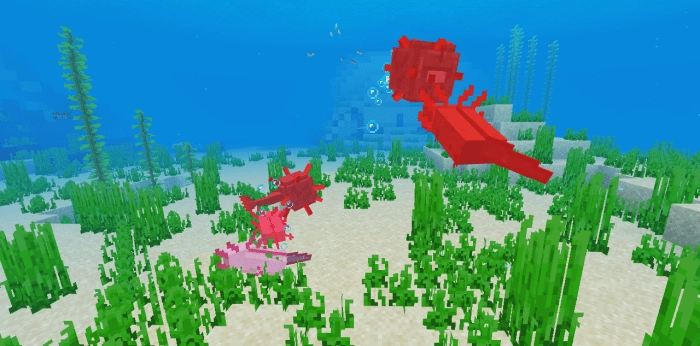 Эти маленькие и чрезвычайно милые создания встретятся вам под водой в Майнкрафт на Андроид. Автор мода Аксолотли (Axolotls) сделал их сразу несколько вариаций, чтобы вам попадались постоянно одни и те же зверушки.