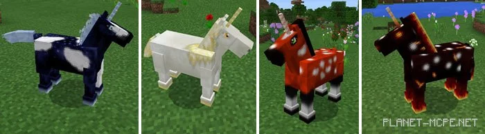 Единорог (замена лошадей) является легендарным животным с одним рогом на лбу. Помимо этого, никаких отличий от лошади мира Майнкрафт Покет Эдишн у него нет.