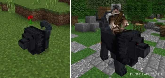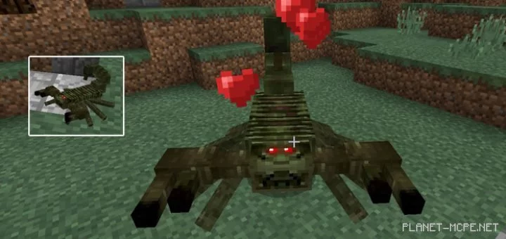 В мире Minecraft PE теперь также будут существовать целых два типа скорпионов. Черный скорпион (замена пещерного паука) является враждебным по отношению к игроку, и будет атаковать Вас при встрече своим ядовитым хвостом. Другой скорпион имеет зелёный цвет (замена обычному пауку) и будет нейтрален по отношению к игроку. Вы можете без проблем приручить нейтрального скорпиона и оседлать его для путешествия по миру МКПЕ.