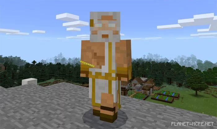 Зевс (замена скелета-иисушителя) — бог неба и грома. Естественно, он будет дружелюбен и не причинит Вам никакого вреда. Но если Вы решите испытать его в битве в мире Minecraft PE, он не пощадит Вас и попытается убить любой ценой. У него 100 сердец и он считается боссом.