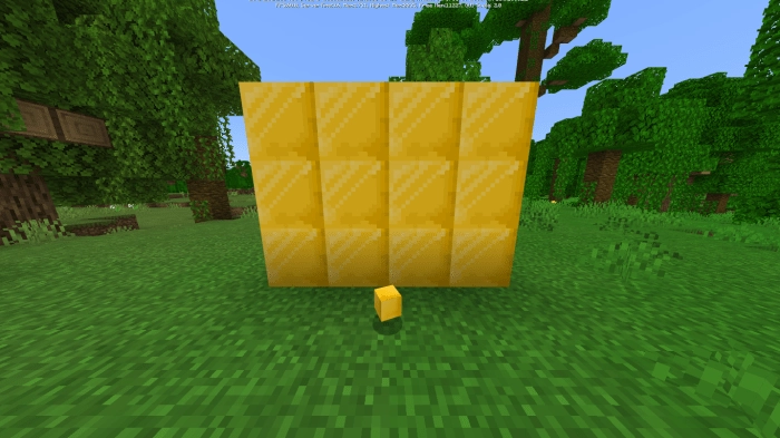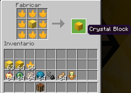 Собрав восемь осколков, Вы можете скрафтить их в кристаллический блок. В центре решетки расположен золотой блок, а про краям — кристаллические осколки.