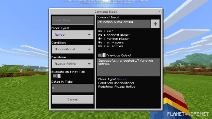 4. Введите «/function autoplanting» в командный блок и установите значения: «repeat (повтор), unconditional (безусловный), always active (всегда активный)».
