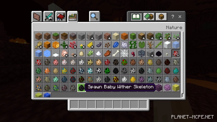В Творческом инвентаре Minecraft Bedrock найдите яйцо спауна дитя скелета-иссушителя. Также Вы можете породить их командой «/summon baby:witherskeleton».
