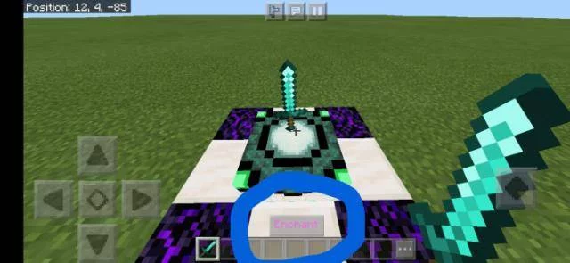 Протестируйте его способность к работе. Дайте персонажу в MCPE в руки алмазный меч и наведите его на стол зачарований. Над центром хотбара должна появиться надпись – все работает.