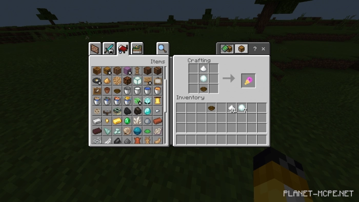 Мороженое: нужно скрафтить 1 кусочек сахара, 1 снег и 1 тарелка.