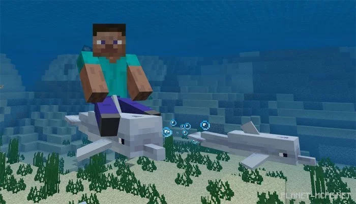 «Dolphin Riding (Ездовые дельфины)» — это первый мод, позволяющий ездить на дельфинах в бета-версии Minecraft PE. Судя по слухам, эта функция будет официально добавлена в предстоящее обновление для MCPE, но если Вы не желаете ждать и хотите испробовать эту функцию уже сейчас, то скачайте данный мод. Однако у Вас будут небольшие ограничения в плане использования. К примеру, Вам не удастся контролировать движение дельфина в Майнкрафт ПЕ.