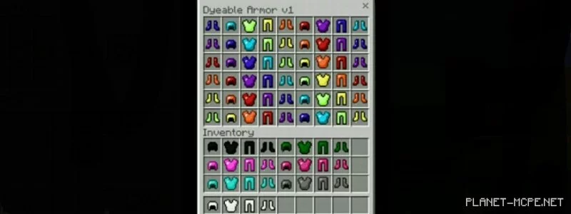 Мод «Dyeable Armor (Красящаяся броня)» добавляет больше цветов для каждого из видов доспехов. Вместо того, чтобы просто умереть в кожаных доспехах Minecraft PE, Вы теперь можете покрасить золотую, железную и алмазную броню, прекрасно реализованные в игре. Мод добавляет в игру более 140 предметов, поэтому Вы можете представить то, сколько работы потребовалось, чтобы добавить новые рецепты и добавить их в творческий инвентарь мира Майнкрафт Покет Эдишн.