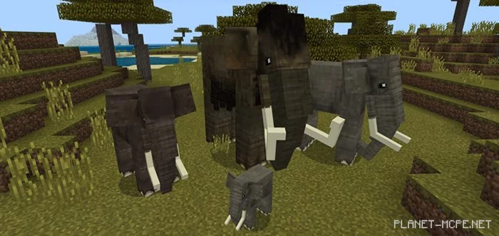 Использовав мод «Elephants and Mammoths (Слоны и Мамонты)» Вы сможете добавить в игру Minecraft Bedrock великолепных слонов и мамонтов. Дополнение будет работать только в бета-версии Minecraft 1.8 с включенным экспериментальным режимом, поскольку именно в этой версии стало возможным добавлять новые идентификаторы, а значит и новые сущности без изменения уже существующих!
