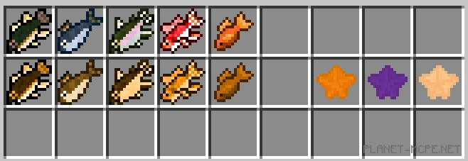 Мод «Fishy (Рыбный)» добавляет в Minecraft Bedrock множество новых рыб. Эти рыбы могут быть пойманы игроком с помощью обычной удочки. Затем рыба может быть приготовлена, с помощью таких блоков, как коптильня и, конечно же, употреблена в пищу.