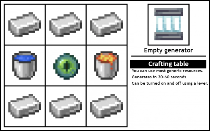 Автор мода Генерация и дублирование (Generate and Duplicate) предусмотрел несколько генераторов, которые позволят получать в Minecraft Bedrock Edition следующие блоки: