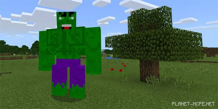 Дополнение «Hulk (Халк)» добавляет вМайнкрафт ПЕ двух мобов. Первый и самый известный из них — Халк, который является вымышленным героем с невероятной физической силой. Второй моб — Халк-Бастер. По факту он представляет собой врага Халка в мире Minecraft PE и очень интересно наблюдать за тем, как они сражаются в битве. Оба моба могут управляться и контролироваться (в некоторой степени) игроками МКПЕ.