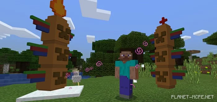 Мод «Jimbo’s Totem (Тотемы Джимбо)» заменит некоторые из существующих в Minecraft PE мобов интерактивными тотемами. Тотемы — это сущности в МКПЕ, которые будут различными методами помогать игрокам, либо исцеляя их, либо убивая вражеских мобов. В этом смысле они будут очень полезны, поскольку они просто будут существовать в мирах Майнкрафт ПЕ и помогать игрокам. Например, Вы можете расположить их вокруг своей базы, чтобы помочь с её защитой.