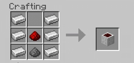Чтобы скрафтить мясорубку, Вам понадобятся 6 железных слитков, 1 пыль красного камня, 1 порох.