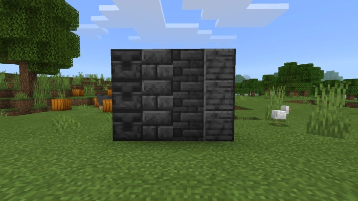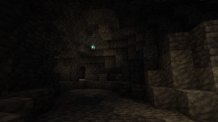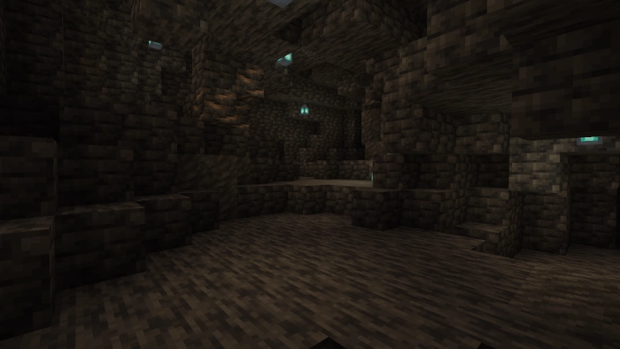 Обратите внимание, что Концепт глубоких пещер (Deep Dark Caves Concept) использует в качестве блока-заполнителя не камни и булыжники в MCBE, а блоки сланца. Автор предлагает вам обработать его, чтобы украсить постройку.