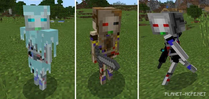 Роботы: Некоторые из враждебных мобов были заменены роботами в Майнкрафт Покет Эдишн. Все они немного мощнее, чем их предшественники. Также лошадь была заменена механической лошадью-роботом.