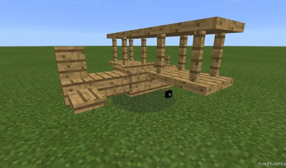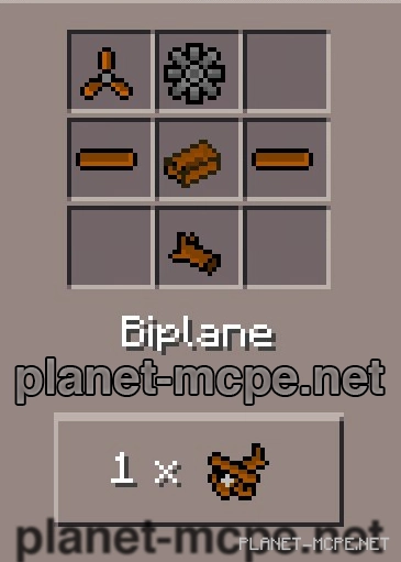 Осматривание мира Minecraft Pocket Edition будет еще захватывающее с самолётом — «Бипланом». Бипланом — Это самолёт с двумя несущими крыльями, как правило, расположены одни над другими. Данная конструкция позволяет получить большую площадь крыльев и подъёмную силу при меньшем размахе крыла, что очень существенно при недостатке прочности. Данный самолет не имеет большую скорость полёта, но перемещение на нём будет намного быстрее чем на наземном транспортном средстве.