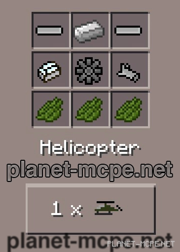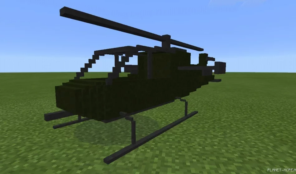 Мод Mech так же добавляет более тяжелею технику, например: военный вертолет на котором вы можете отправляться на разведку по миру MCPE. На нём вы смоете поражать ваши цели т.к. вертолет имеет две пушки, одна с которых стреляет пулями (стрелы), а вторая ракетами (TNT). Кроме военного вертолёта в вашем ангаре может стоять военный самолёт, танк и другая крутая техника, которая придёт вместе с модом Mech!
