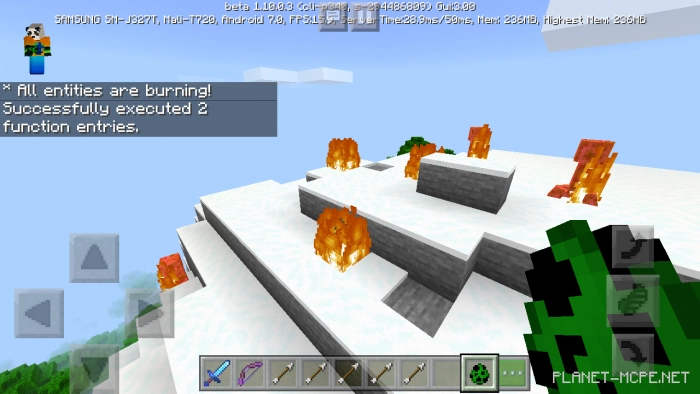 На картинке ниже использована функция /function megaweapon_sword и /function megaweapon_bow для получения предметов на панели быстрого доступа Майнкрафт Бедрок.