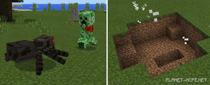 У Вас появился хороший друг в Майнкрафт ПЕ — крипер. Он больше не будет пытаться атаковать игроков, а вместо этого он будет пытаться нанести вред другим враждебным мобам, таким как паук. Изображения ниже были сделаны до последнего обновления, в котором были представлены новые текстуры, но в скором времени мы постараемся их обновить.