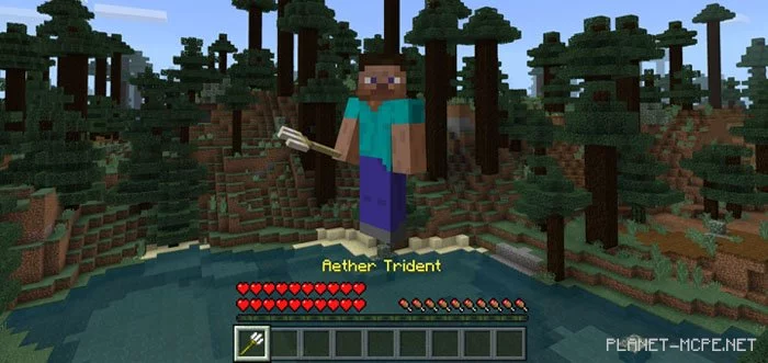 Эфирный трезубец — это новый предмет, который дарует Вам богоподобные силы. Используя этот предмет в Minecraft PE Вы станете быстрее, получите больше здоровья, а также сможете летать! Просто Вам стоит следить за тем, чтобы не потерять его, иначе Вы потеряете все преимущества и Вам придётся искать для себя новый трезубец. Просто имейте в виду, что Вам потребуется последняя бета-версия (или обновление Aquatic), чтобы использовать мод «The Aether Trident (Эфирный трезубец)».