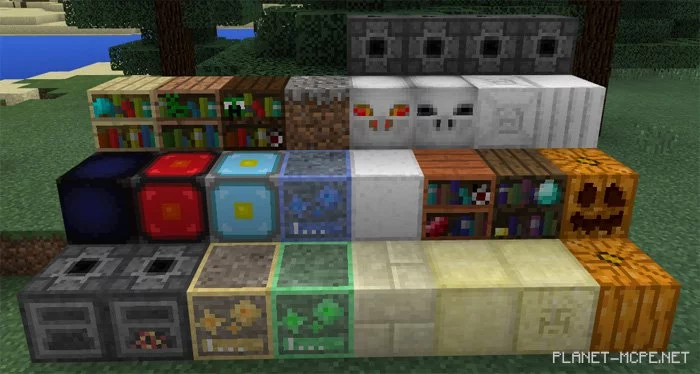 Мод «More Blocks (Больше блоков)» 52 новых блока, которые включают в себя такие блоки, как резаные деревянные блоки и другие декоративные блоки в Minecraft Pocket Edition. Самое приятное здесь то, что он не заменяет абсолютно никакие существующие в МКПЕ блоки. Это действительно отличный мод, если Вы устали от существующих блоков и хотели бы использовать какие-либо новые декоративные идеи в Ваших мирах Minecraft PE. Некоторые из включенных блоков — это алмазы, изумруды и красиво вырезанные деревянные блоки.